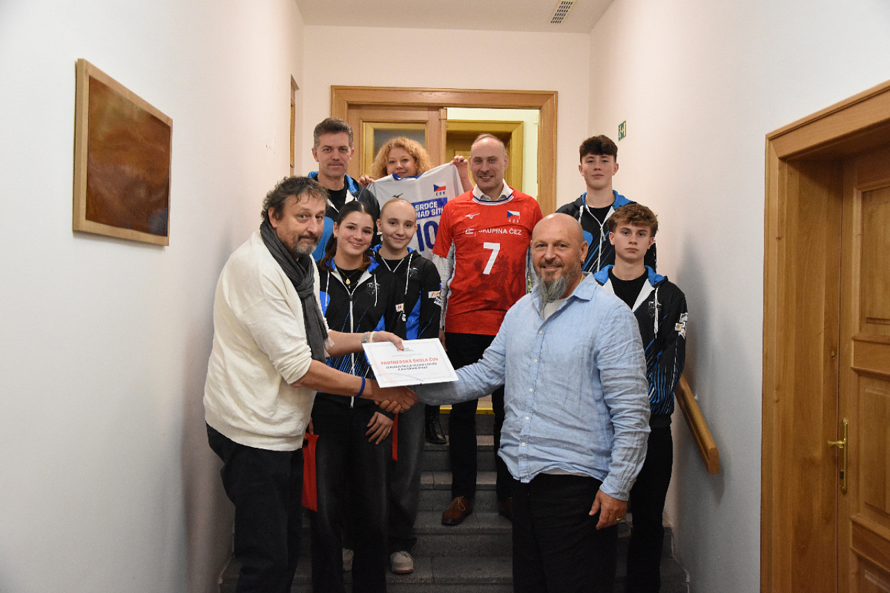 Takže ve Znojmě to v dohledné době nebude. Předávání mělo proběhnout na radnici města a tak jsme se nalodili do jedné ze tří školních dodávek, které svým zjevem nenechaly nikoho na pochybách, jaký že se to na škole provozuje sport. Jsem častým návštěvníkem Znojma a okolí, coby cyklista, ale radnice pro mě byla samozřejmě neznámá. Přivítal nás starosta města Mgr. František Koudela, Ing. Denisa Krátká. Školu ještě zastupoval Mgr. Mário Zelený – učitel TV, trenér a předseda VK Znojmo Přímětice. Předání se také zúčastnili zástupci těch, kteří nás zajímají nejvíce – žáci, hráči, Ivana Klajmonová, Veronika Kučerová, Marek Švaříček, Antonín Venkrbec.