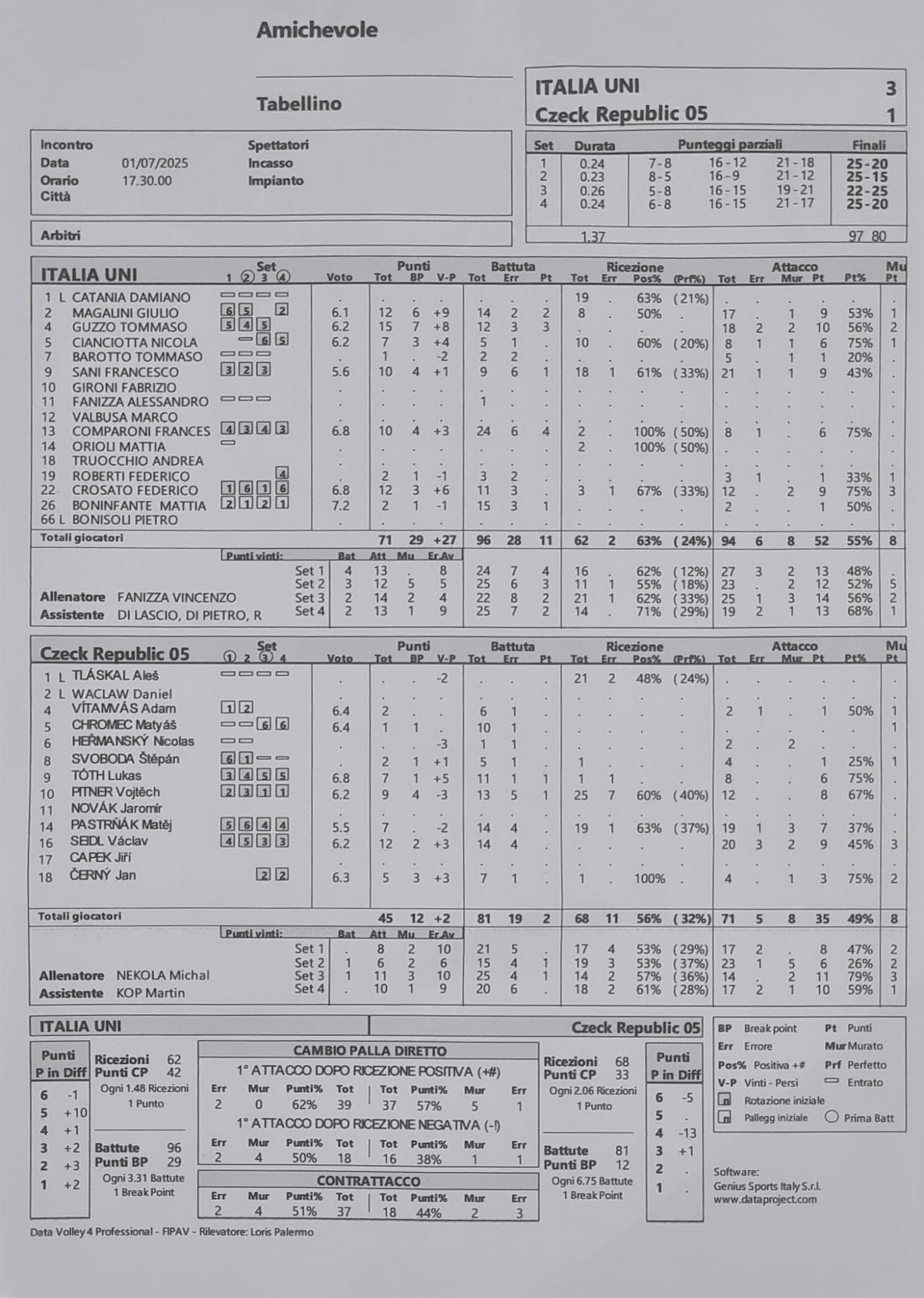 První přátelské utkání sehráli naši reprezentanti proti Univerzitnímu týmu Itálie. Kromě druhého setu, ve kterém byl italský tým důraznější na servisu, bylo utkání vyrovnané. Pomohl si jedenácti esy proti našim dvěma a následně pak výbornou obranou v poli, kde získal o dvacet míčů více než Češi. V efektivitě útoku (55% - 49%) a v bloku (8 – 8) hrál náš tým vyrovnanou partii. Pro svěřence Michala Nekoly to byla rozhodně výborná zkušenost proti starším hráčům, kteří působí i v italské A1.