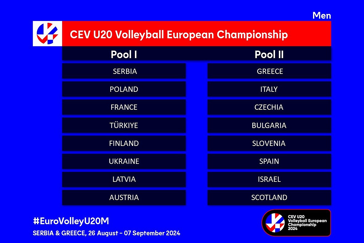 Poslední letošní evropský šampionát under age ve volejbale čeká chlapeckou kategorii U20. Turnaj proběhne 26. 8. – 7. 9. 2024 za spolupořadatelství Srbska a Řecka. Šestnáct účastníků bylo nalosováno do dvou základních skupin. Češi figurují v té řecké, ve městě Arta, kde od pondělí budou bojovat o postup mezi nejlepší čtyři týmy ME U20 2024.