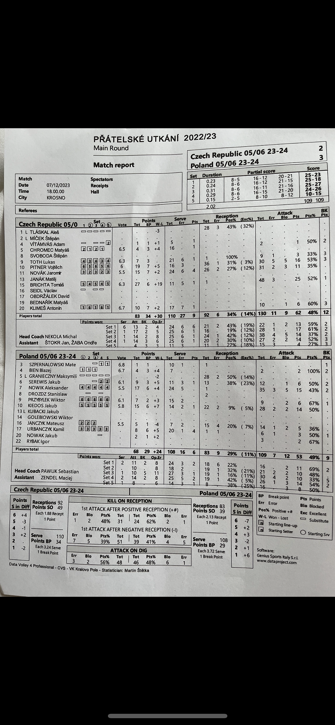 Sestava CZE: Klimeš, Chromec, Novák, Tóth, Brichta, Pitner, libero Tláskal. Střídali: Vítámvás, Seidl