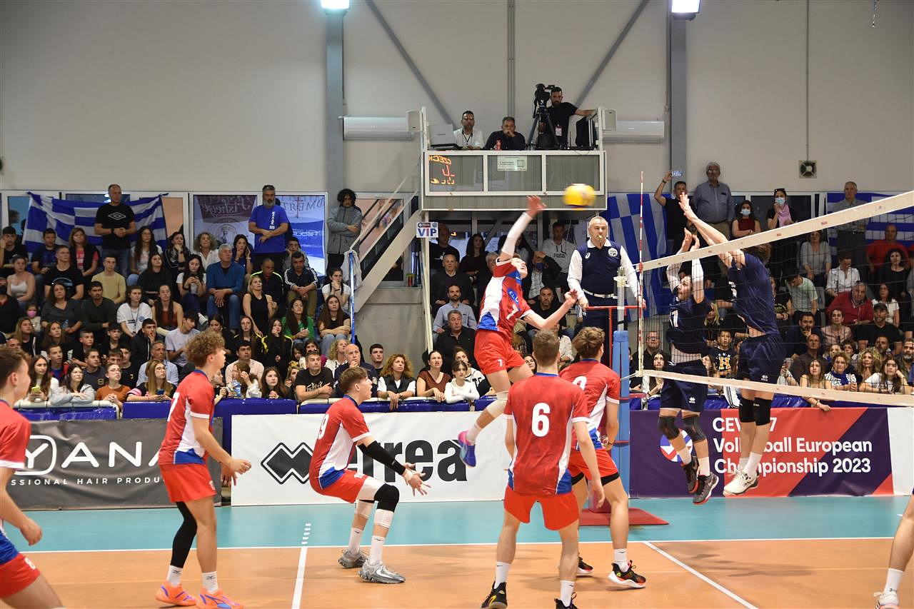 V neděli poslední zápas proti domácím a bylo jasné, že na přímý postup bude stačit jen výhra 3:0, nebo 3:1. V hledišti statečně bojovali čtyři naši fanoušci (děkujeme!!), ale přesila devíti stovek bouřlivých Řeků byla obrovská. Naše hra je dva a půl setu držela na uzdě. Naši kluci lépe podávali, útočili i bránili, takže zaslouženě vedli 2:0 a pokračovali ve výborném výkonu až do stavu 16:10 v třetím setu. Pak se náš „stroj“ zadrhl a při prohrané koncovce 23:25 diváci málem „zbořili“ halu. Iniciativu přebrali Řekové a o všem musel rozhodnout tiebreak. Naši kluci ustáli obrovský tlak diváků, lepšícího se soupeře i domácích čárových rozhodčích a po výhře 16:14 jsme zvítězili 3:2.