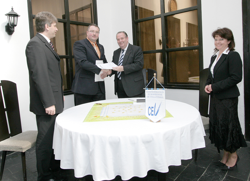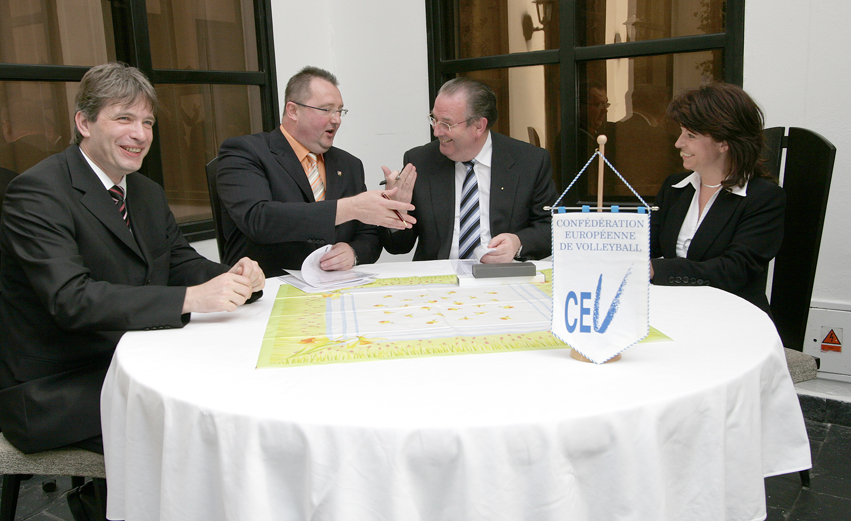 Podpisu se samozřejmě zúčastnili také představitelé města Brna: primátor, p. R. Onderka (na předchozích snímcích první zleva) a náměstkyně primátora, pí. B. Javorová (první zprava); konečně ještě někteří další funkcionáři ČVS (pp. J. Hronek, místopředseda CEV i ČVS, J. Žižka, generální sekretář ČVS) i CEV (p. Renato Arena, také místopředseda CEV a v Brně předseda jury ME kadetek).