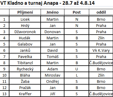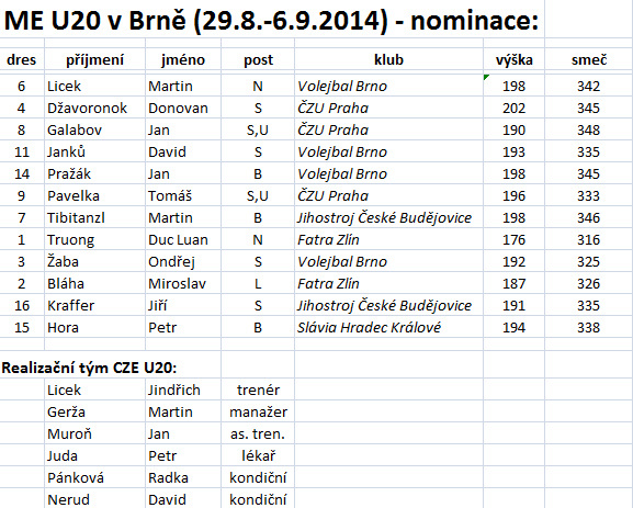 | 9. | 29.7.-4.8. | VT | Kladno, Turnaj Memoriál Česnokova, Anapa (RUS) 1.-3.8.2014, nominace - info Rusko (1. místo MS 2013 U19), Čína (2. místo MS 2013 U19), Polsko (3. místo MS 2013 U19), Česká republika (pořadatel ME 2014 U20) 1.8. Rusko - Česká republika 3:0 (18,23,20) 2.8. Čína - Česká republika 0:3 (-20,-20,-20) 3.8. Polsko - Česká republika 2:3 (16,-16,-19,23,-13) Konečné pořadí: 1. Čína, 2. Česká republika, 3. Rusko, 4. Polsko - info |
