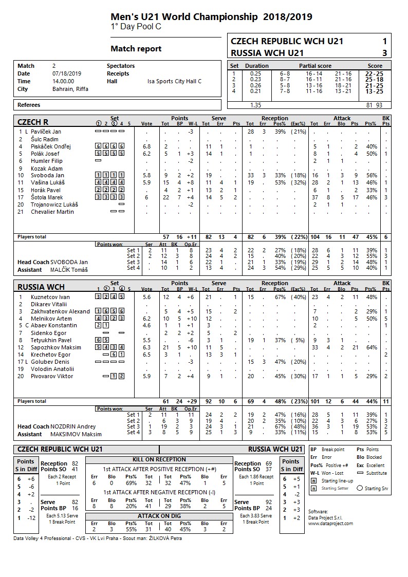 V prvním utkání 2019 FIVB MS U21 naše reprezentace (99/00) narazila na silné Rusko. Přestože naši mladíci vstoupili do utkání dobře a minimálně polovinu utkání byli lepším týmem, odcházejí poraženi 3:1. První polovina utkání velmi připomínala finále minulého ME, každý chvilku tahal pilku. V prvním setu si naše družstvo vytvořilo těsně před koncovkou až pětibodový náskok (21:16). Bohužel se nám nepodařilo v nepříjemném postavení s diagonálním hráčem na hlavním kůlu otočit a Rusové tlaku využili k zisku prvního setu. Druhý set byl celý v naší režii. Bohužel vstup do třetího setu nevyšel podle našich představ a stále ztrácíme, dva-tři body, což se v koncovce ukazuje jako zásadní. Začátek čtvrtého setu je kopie třetího, Rusové si udělali malý náskok, který postupně zvyšovali. Od půlky setu už byla vidět v naší hře křeč a začali jsme kupit nevynucené chyby.
