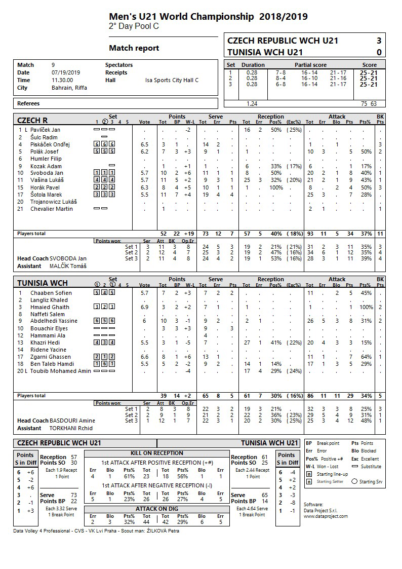 Jan Svoboda (trenér): „Možná to tak nevypadá, ale jednoduchý zápas to nebyl. Obě družstva včera prohrála a měla „nůž na krku“. Začátek byl z naší strany dost nervózní, kluci si uvědomovali, že pouze vítězství jim zachová šance na postup. V každém setu to bylo k druhému technickému time outu celkem vyrovnané, ale následně ani v jednom setu nedopustili kluci dramatickou koncovku a došli si pro vítezství. Tunis se oproti včerejšku určitě zlepšil na servisu a jsem rád, že Pavlíček se Svobodou se s tím poprali a přijímali jsme velice slušně.“