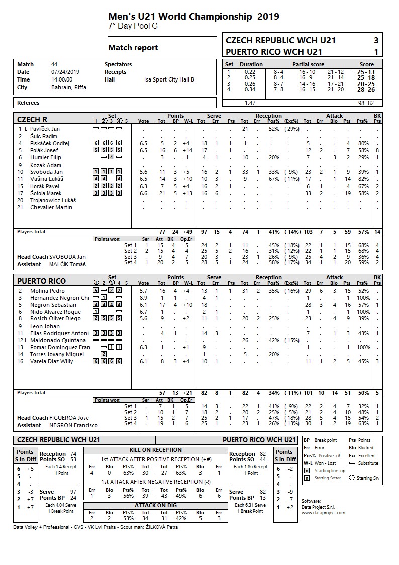 Máte zápasy, kdy musíte vyhrát, kdy můžete vyhrát nebo které jsou „povinností“. Pro naše borce (99/00) platilo první. Museli vyhrát, jinak by skončili až na třetím místě ve skupině 2019 FIVB MS U21 a to by byl průs….. Naopak soupeř z Portorika po dopoledním vítězství Egypta nad Kanadou věděl, že bude poslední ve skupině tak jako tak. Podle toho to taky první dva sety vypadalo. Naši kluci hráli koncentrovaně bez chyb, naopak soupeř chyboval jako na posledním „pouťáku“. Nervy začaly od třetího setu, Češi nepochopitelně polevili, pustili Portoriko zpět do zápasu a nebýt v koncovce čtvrtého setu neomylného Vašiny, mohlo být všelijak. Nakonec jsme zápas „urvali“ silou a bojovností, ale příště by se nám takový výpadek mohl zle vymstít.