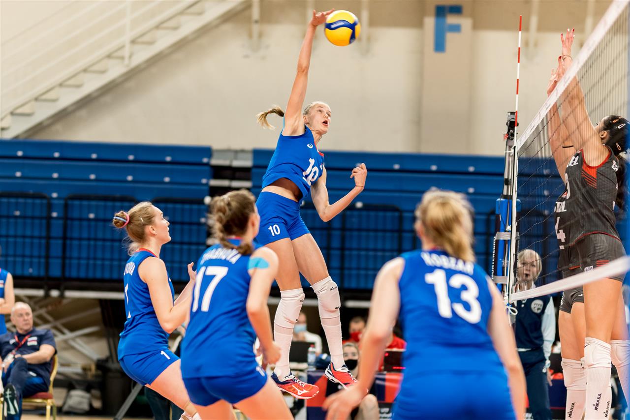 Skupina B měla dva dominantní týmy – Rusko a Srbsko. Ve vzájemném souboji o první místo zvítězilo Rusko 3:0 (22, 11, 23). V zápase dominoval ruský útok, srbský tým měl 11 vítězných bloků proti 8 ruským. V souboji dominantních útočnic svých týmů byla efektivnější ruská smečařka Fedorovtseva Arina (35/18 vítězných útoků a zisk 21 bodů pro svůj tým) než diagonální hráčka Srbska Uzelac Alexandra (42/18 vítězných útoků a zisk 18 bodů pro svůj tým). Pořadí po odehrání skupiny bylo následovné: 1. Rusko, 2. Srbsko, 3. Polsko, 4. Rumunsko, 5. Bělorusko. V této skupině hrály vítězové svých lednových kvalifikací – Rusko vítěz východní zóny EEVZA a Srbsko – vítěz balkánské zóny (ve finále porazilo překvapivě 3:0 domácí Turecko). Týmy Polska, Rumunska a Běloruska postoupily na základě žebříčku CEV!