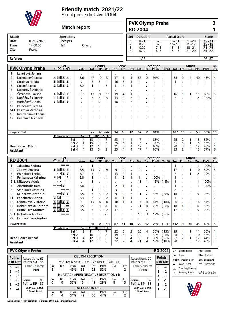Čtvrtý jarní blok přípravy RD 04/05 ve Sportcentru v Brandýse nad Labem jsme zvládli ve čtyřdenní přípravě (13. - 16. března 2022) pět tréninkových jednotek včetně dvou kondičních – posilovna s kondičním trenérem Davidem Nerudem a také přípravného zápasu v úterý 15. března 2022 na hale Olympu Praha s extraligovým týmem žen.