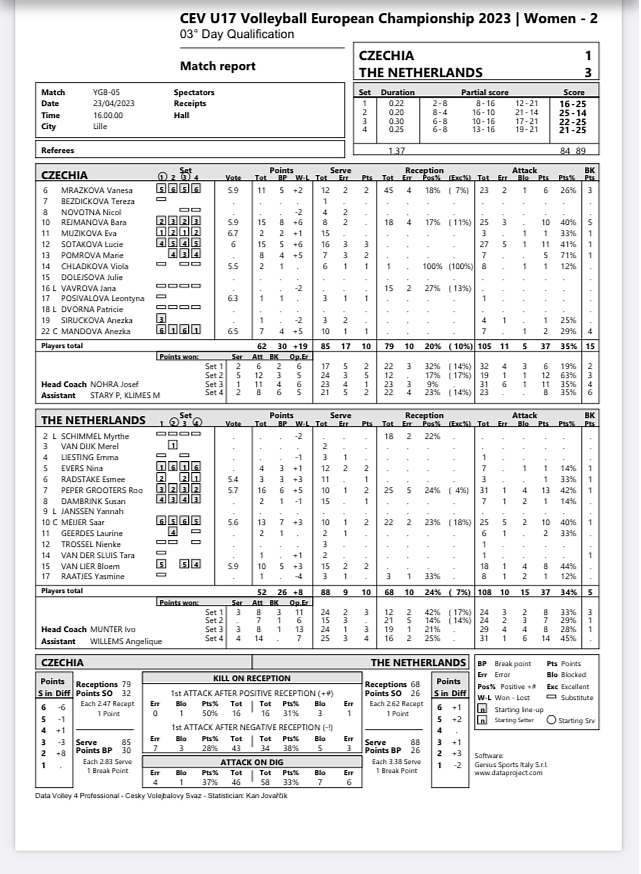 Zbytek utkání nabídl další dvě vyrovnaná dějství, ve kterých naše reprezentantky dobře takticky zatlačily Nizozemky servisem. Zkušenější Nizozemky, které měly ve svých řadách několik hráček se zkušenostmi z evropského šampionátu z roku 2022, prokázaly ale svou kvalitu a v koncovkách následujících dvou setů přetlačily naše družstvo. Po výhře 3:1 získaly Nizozemky další tři body do tabulky a s plným počtem bodů tak ovládly celou kvalifikační skupinu.