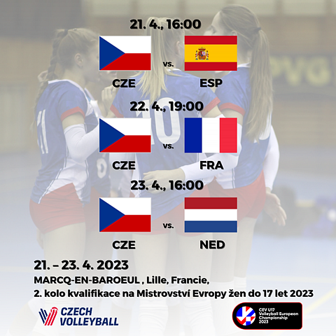 V pátek čeká naše reprezentantky v zahajovacím utkání kvalifikace druhý celek regionálního turnaje WEVZA 2023, Španělsko. Druhý den následuje zápas s domácí reprezentací, která hraje všechna svá utkání ve večerních hodinách. Turnaj o dvě postupová místa na ME U17 2023, které se odehraje v druhé půlce července v Srbsku a Maďarsku, zakončí česká reprezentace nedělním utkáním proti Nizozemsku.
