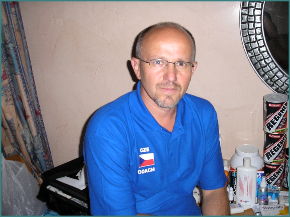 Hráčky v tuto chvíli už zásobuje svým masérským uměním masér Jindra Douda (má dnes svátek a tak mu hráčky při odjezdu na trénink zazpívaly) a pan doktor Ondra Hloch předvádí v praxi svoji přednášku o pitném a stravovacím režimu, který je třeba během turnaje dodržet.