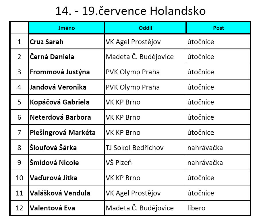 | 11. | 14.-19.7. | VT+MU | 14.7. Brandýs n/L, 15.-19.7. MU Nizozemsko, Doetinchem (NED), nominace 16.7. Nizozemsko - Česká republika 2:3 (20,21,-17,-23,-4) info 17.7. Nizozemsko - Česká republika 3:1 (20,-17,22,20) 18.7. Nizozemsko - Česká republika 3:2 (20,18,-21,-25,9) |