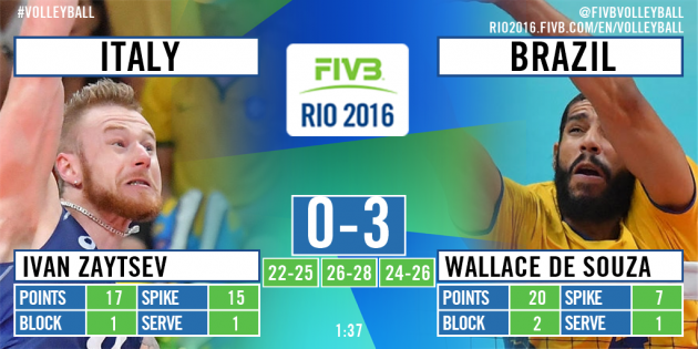 Ve finálovém boji předvedli spolehlivější a vyrovnanější výkon během celého utkání domácí Brazilci, nepoložila je ani situace ve druhém setu, kdy neudrželi vedení 24:22 a následně čelili i dvěma italským setballům. Brazílie zvládla druhý set v poměru 28:26 a to zřejmě rozhodlo o průběhu zbytku utkání. Nedařilo se, tak jako v předchozích duelech, ani tradičním oporám Italů - Zaytsevovi s Juantorenou, kteří zaznamenali "pouze" 17, resp. 14 bodů.