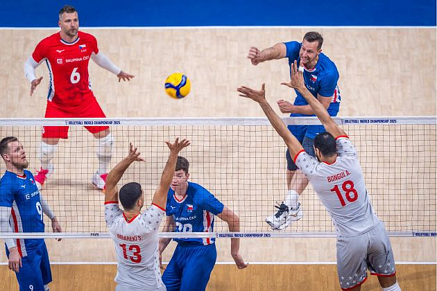 V osmifinálovém utkání světového šampionátu se českým volejbalistům podařilo bez ztráty setu vybojovat vítězství nad Tuniskem a dosáhnout tak historického postupu do čtvrtfinále. Po jasném českém zisku první a druhé sady se soupeři ve třetím setu dostali do sedmibodové výhody, svěřenci Jiřího Nováka ale zlepšili hru v poli, zatlačili servisem, zpřesnili útok a průběh rozhodující části utkání otočili ve svůj prospěch. Čeští volejbalisté osmkrát skórovali přímo z podání. Patrik Indra skóroval čtrnáctkrát, 13 bodů přidali smečaři Jan Galabov a Lukáš Vašina. Soupeřem českých volejbalistů bude ve čtvrtečním čtvrtfinále (9:30 našeho času) Írán, který zdolal Srbsko 3:2.