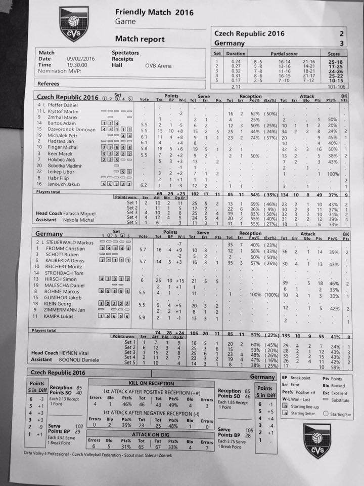 1. zápas: Česká republika - Německo 2:3 (18, -17,-24, 22, -10)