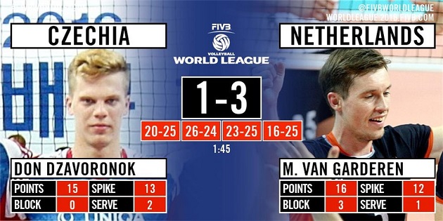 Lepší vstup do utkání zažilo Nizozemsko, které úvodní sadu získalo poměrem 25:20. Druhý set se pak dlouho vyvíjel příznivěji pro český tým, ale Nizozemci v závěru náskok svěřenců Miguela Falasci dokázali smazat a šlo se do napínavé koncovky. Tu zvládl lépe český výběr a získat druhou sadu v poměru 26:24. Holandský výběr dobře servíroval, v utkání zaznamenal celkem osm přímých bodů z podání, oproti třem českým. I to byl rozdíl ve vyrovnané třetí sadě, kterou nakonec získali Nizozemci 25:23 a vedli 2:1 na sety. Čtvrtá sada pak měla nejjednoznačnější průběh, soupeř českého mužstva byl jistější ve všech herních činnostech a po setu 25:16 zvítězil celkově 3:1 na sety.