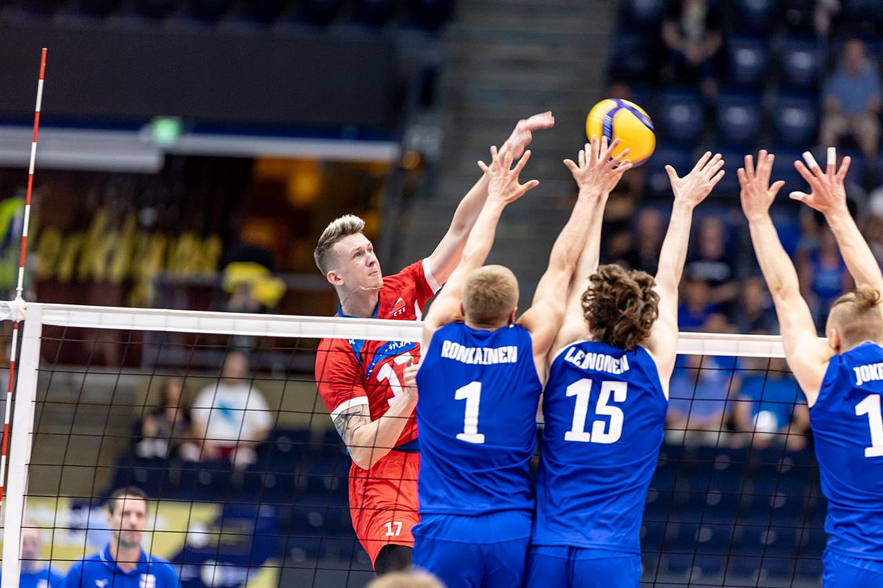 V Tampere nastoupil proti domácím Finům český tým v silné sestavě s Jiřím Srbem na nahrávce. Obě mužstva se střídala na servisu a úspěšně a tvrdě útočila. Bezchybně hrajícím Čechům se postupně podařilo vybudovat čtyřbodový náskok a po Šotolových esech vedli už 14:8. Svěřencům Jiří Nováka se dařilo i na bloku, naopak Finové kazili příjem i útok a brzy prohrávali o 11 bodů. Severský tým sice snížil ztrátu, ale druhý setbol Čechů ukončil úvodní sadu za stavu 17:25.