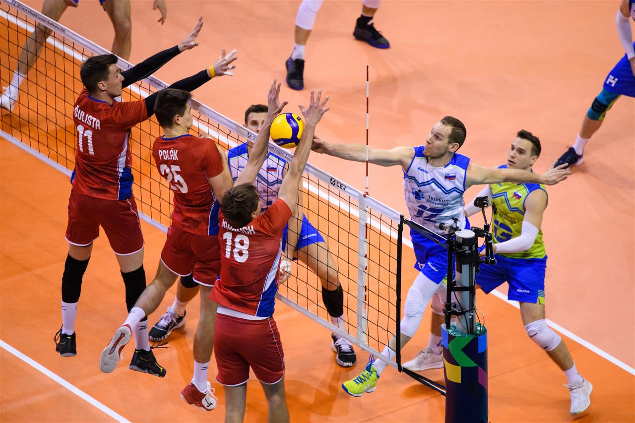 Do čtvrtého setu vstupujeme opět lépe (5:2) a je tu hned timeout Slovinců. Jsme opět v zápase, jen se teď vyvarovat zbytečných chyb. Stále si udržujeme náskok tří bodů (8:5, 10:7). Nekompromisní blok Šulisty na Šterna zvyšuje náš náskok na 12:7 a další bod přichází po útoku Šulisty. Za stavu 14:8 to začíná vypadat opravdu nadějně. A když Indra přidá eso, blížíme se ke koncovce s velkým náskokem. Bohužel tři esa soupeře nás tohoto velkorysého náskoku zbavují, 15:12. Blokem z těžkého postavení pomáhá Patočka. Na hřiště se vrací Galabov, ale nepomáhá to a soupeř se přibližuje. Zpátky je i Michálek a drží náš prapor nahoře přesným útokem z handy. Do koncovky jdeme s dvoubodovým náskokem (20:18) a po šťastném servisu Indry je stav 22:19. Timeout Slovinců ukazuje, že jsou pod tlakem. Soupeř si pomáhá, jak jinak než servisem, ale stále vedeme 23:21. Dalším esem Slovinci srovnávají na 23:23. Trenér Nekola si bere oddechový čas. Indra měl na ruce setbol, bohužel ho zastavila páska. Ani druhý setbol se nám nedaří proměnit. Ne, ani třetí setbol neuhráváme. To Slovinci proměňují hned první mečbol a radují se z vítězství 3:1. Přestože to po prvním setu vypadalo na pořádný „výprask“, nakonec náš tým odehrál vyrovnaný zápas se stříbrným týmem ME 2019 a prohrál ho v setech, kdy v každém (kromě úvodního) měl tři setboly.