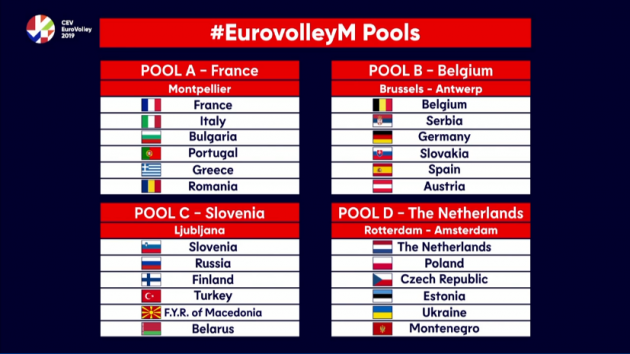 Po malých organizačních zmatcích začátkem týdne, bylo 24 družstev (poprvé v historii ME) rozděleno do šesti losovacích košů. Do čtyř základních skupin ME 2019 byly nasazeny hostitelské země Francie, Belgie, Nizozemsko a Slovinsko. V prvním koši jsme našli volejbalové velmoci Rusko, Srbsko, Polsko a Itálii. Naše reprezentace byla nasazena do koše číslo dva spolu s Bulharskem, Německem a Finskem. Třetí koš obsadila družstva Estonska, Slovenska, Turecka a Portugalska, čtvrtý koš byl připraven pro týmy Španělska, Ukrajiny, Řecka a Makedonie a poslední pátý koš zbyl na Bělorusko, Černou horu, Rumunsko a Rakousko. V 18:30 začalo slavnostní losování, zvědavost a nervozita v jedné z kopulí bruselského Atómia se dala krájet.