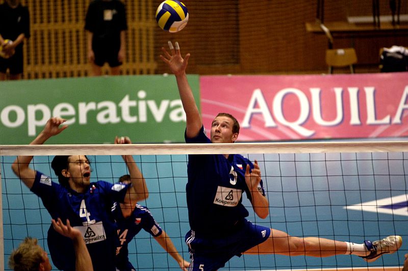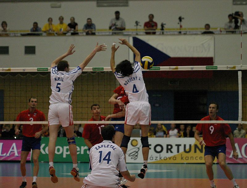 Král Jiří (právě našeho "střeďáka" máme na dvou snímcích: ve dvojbloku s J. Novotným a samotného, jak se snaží ulít nepříliš povedený míč,