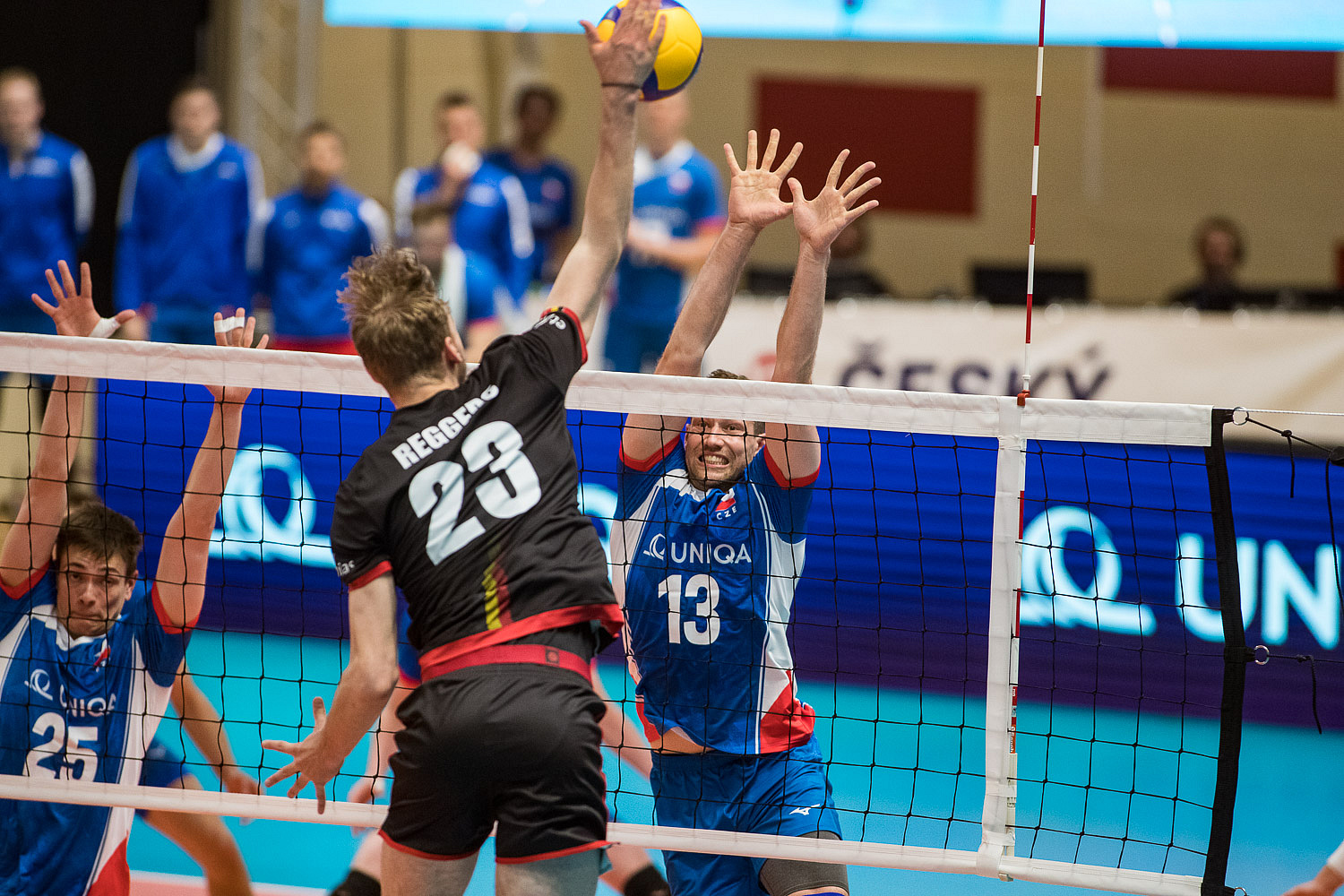 Úvod prvního setu vyšel lépe Belgičanům, kteří vedli 3:1 i 4:2, vzápětí ale Jan Galabov po úspěšném útoku vyrovnal na 4:4 a čeští volejbalisté postupně převzali iniciativu – soustředěným tlakem donutili Belgičany k chybám a otočili na 8:5. Belgický trenér si vzal oddechový čas, který ale jeho mladému týmu výrazně nepomohl. Precizní čeští reprezentanti, které v této části hry v poli táhla zejména spolupráce Jakuba Janoucha s Janem Galabovem, vévodili prvnímu setu – postupně vedli 11:7, 15:10 i 19:14. Sérií chyb však nabídli Belgičanům možnost zdramatizovat závěr úvodního sady – hosté dokonce vyrovnali na 23:23 a trpělivým útokem odvrátili první český setbol. U druhého už domácí tým nezaváhal, úspěšným blokem na síti ho proměnila dvojice Patrik Indra – Adam Zajíček a svěřenci Jiřího Nováka získali první set poměrem 26:24.