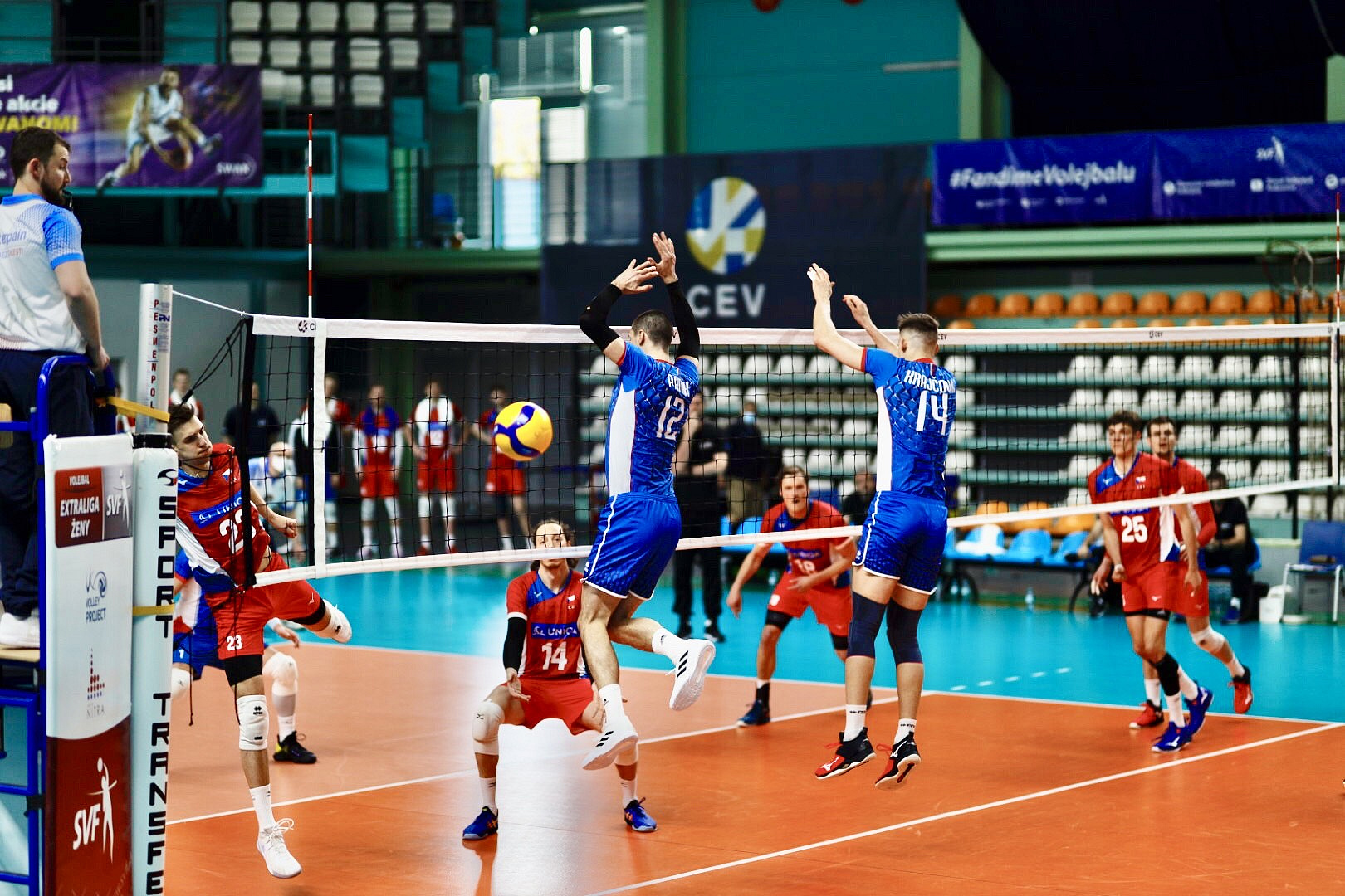 Začátek utkání nabídl vyrovnaný boj, oba týmy ztrátují po oboustranně dobrém příjmu, útočně se daří oběma univerzálům Indra/Michalovič. Zmiňovaný Indra srovnává na 11:11 esem. Po bloku Ondroviče na Michálka jdou domácí do vedení 13:11. Záhy náš tým srovnává dalším esem Adama Bartoše. I v dalším průběhu si Slováci udržují 1-2 bodový náskok, nám se nedaří vyrovnat. Až blok Špuláka srovnává skóre na 21:21, po dobré obraně se proti trojbloku prosazuje Michálek a za stavu 21:22 si domácí berou oddechový čas. Indra je při chuti, udržujeme jednobodový náskok, jeho protějšek na postu univerzála Michalovič útočí do autu, 21:23. První setbol proměňuje blokem pozorný Špulák po výborném podání Janoucha.