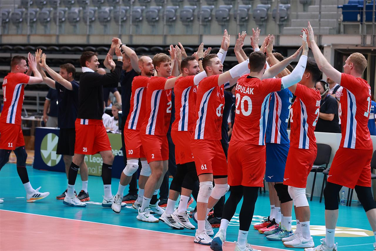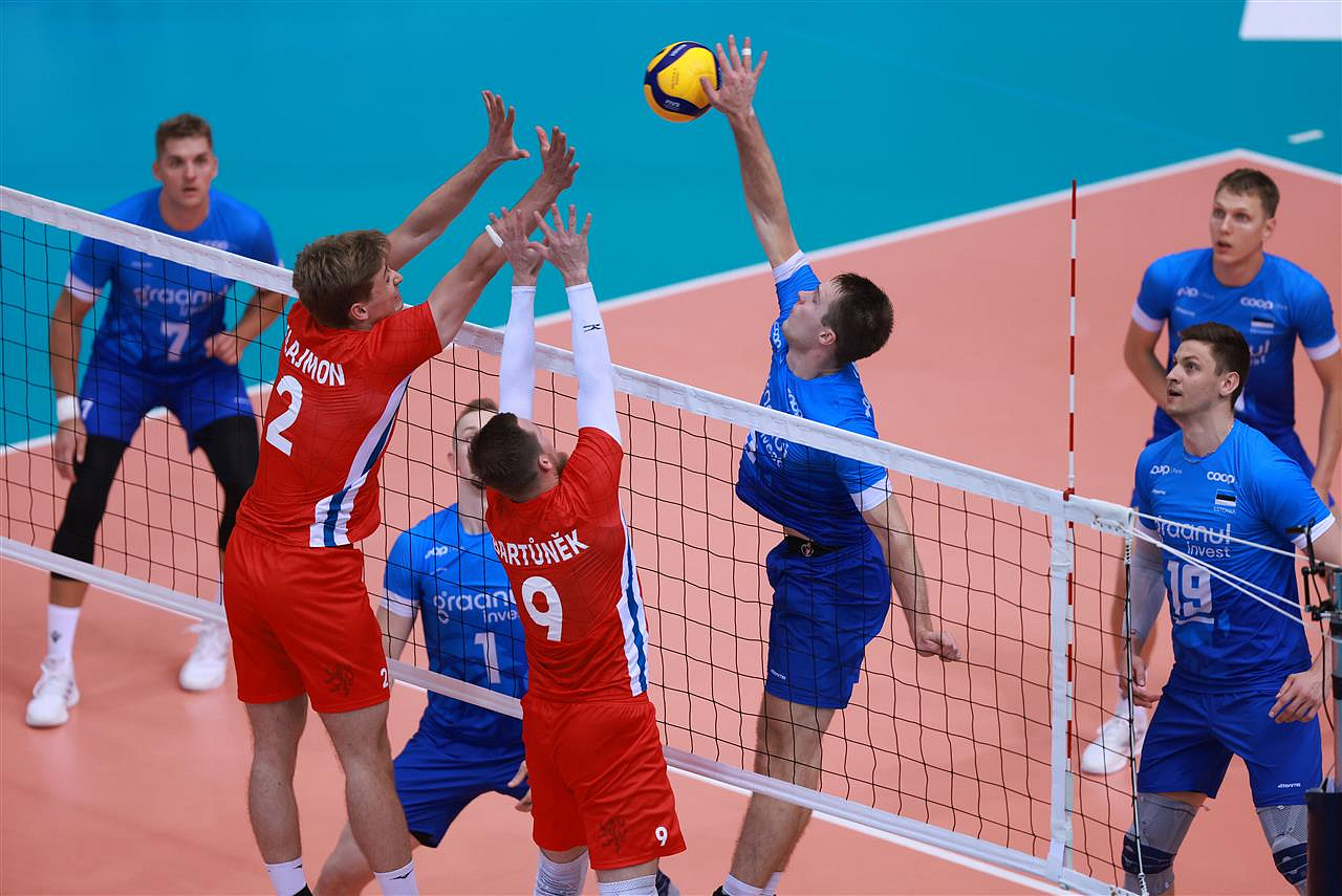 Ve zkrácené sadě se o dva body výše dostali volejbalisté z Estonska, hráčům v červeném se ale podařilo opět srovnat na 10:10 a dojít si pro mečbol. Bodovým blokem ukončil utkání Klajmon.