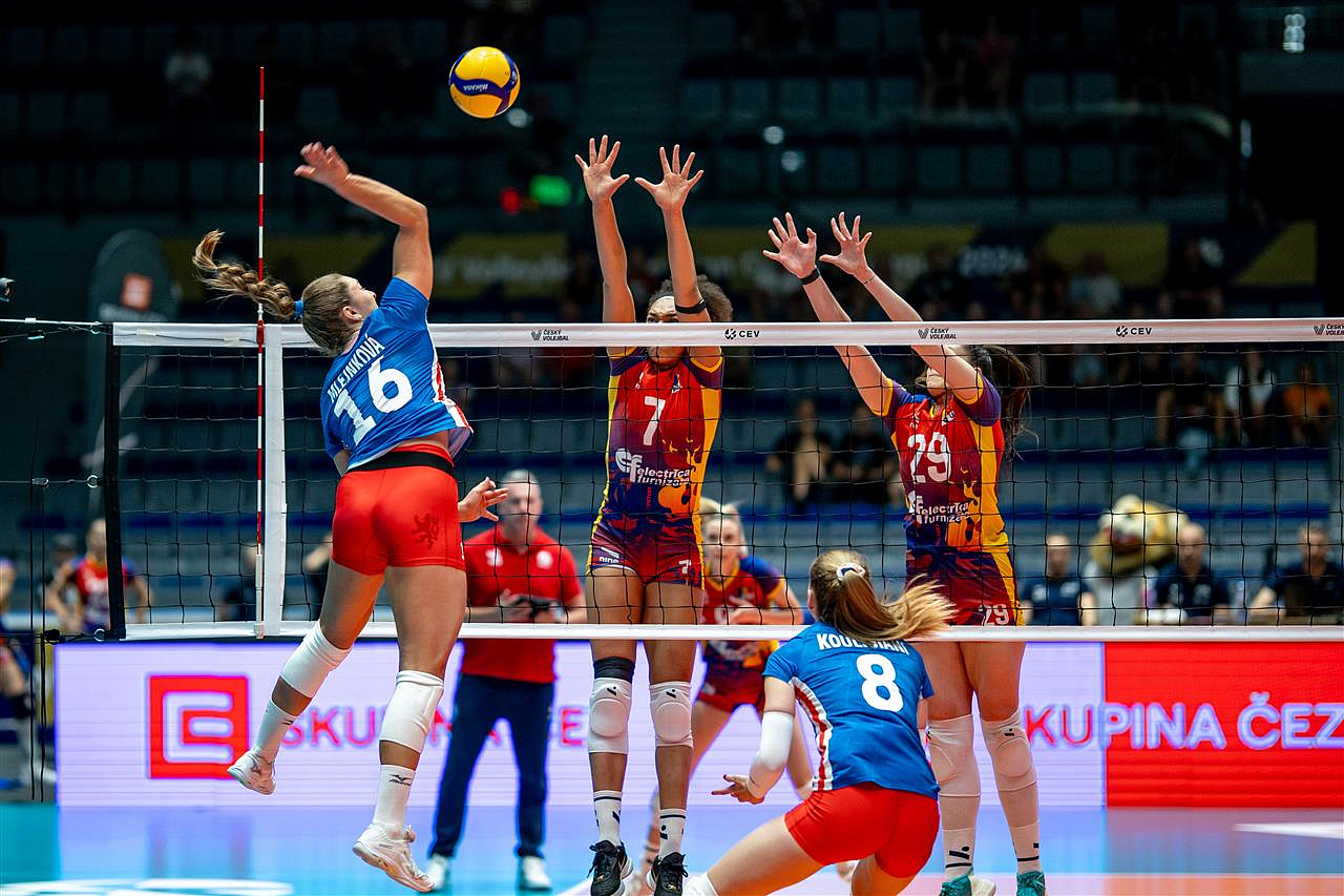 Semifinále Zlaté evropské ligy zahájily výrazně lépe rumunské volejbalistky, které brzy vedly 7:2 a donutily český tým k oddechovému času. Pětibodový rozdíl se nezmenšoval, naopak narostl na 16:8 pro Rumunsko. České body přidávala především kapitánka Mlejnková, eso Valkové znamenalo přiblížení skóre na 15:19 z pohledu domácích. Rumunky ovšem drama v úvodním setu nedovolily.