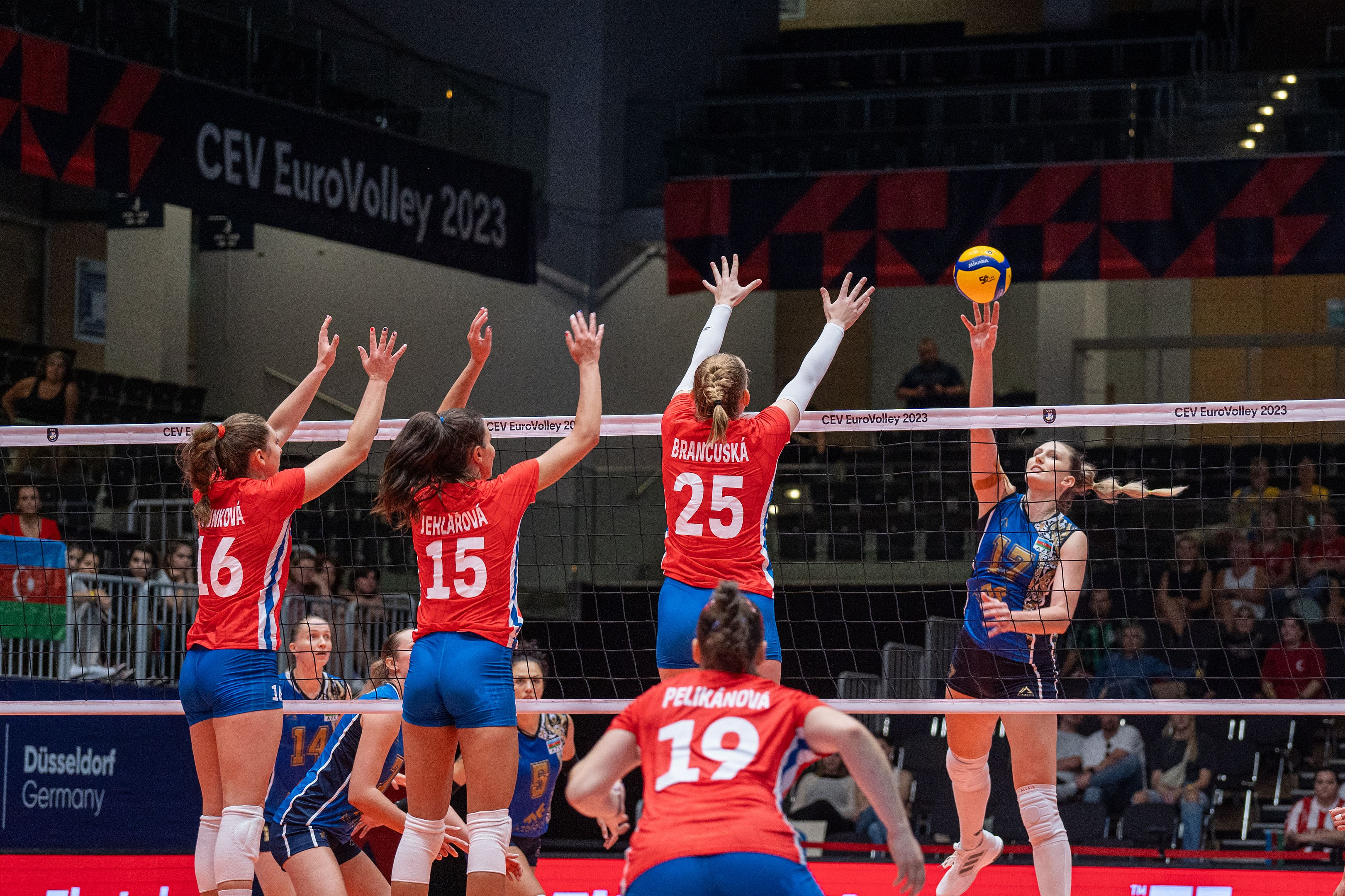 V úvodním utkání mistrovství Evropy předvedly Češky nepodařený výkon a hráčkám Ázerbájdžánu podlehly jednoznačně po setech 25:21, 25:10, 25:15. Především v druhé a třetí sadě se nedostaly do hry, chyběla jim agresivita při podání i v útoku, v obraně byly neúspěšné a chyběla i kvalitní nahrávka. 9 ze 46 českých bodů zaznamenala Gabriela Orvošová, na straně soupeřek byly nejvíce bodujícími hráčkami Rahimova (17 bodů) a Ruban (15 bodů).