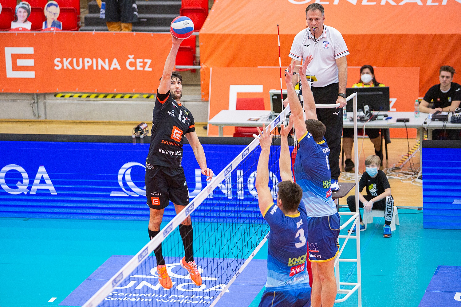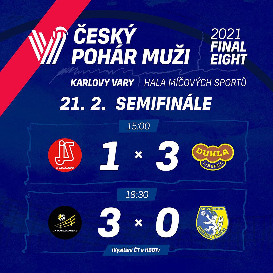 Dnes měl Český pohár mužů 2020/21 na programu semifinálové bitvy. V prvním utkání se potkal obhájce trofeje z Českých Budějovic s Duklou Liberec. Jihostroj se včera překvapivě dost trápil s týmem Beskyd, Dukla jasně přehrála Brno. Druhé semifinále proti sobě svedlo domácí ČEZ Karlovarsko a překvapení letošní sezóny, tým z nedalekého Ústí nad Labem. Karlovarsko si ve včerejším čtvrtfinále ve třech setech poradilo s pražskými Lvy a Ústí do semifinále přešlo až po pětisetové bitvě přes Kladno.