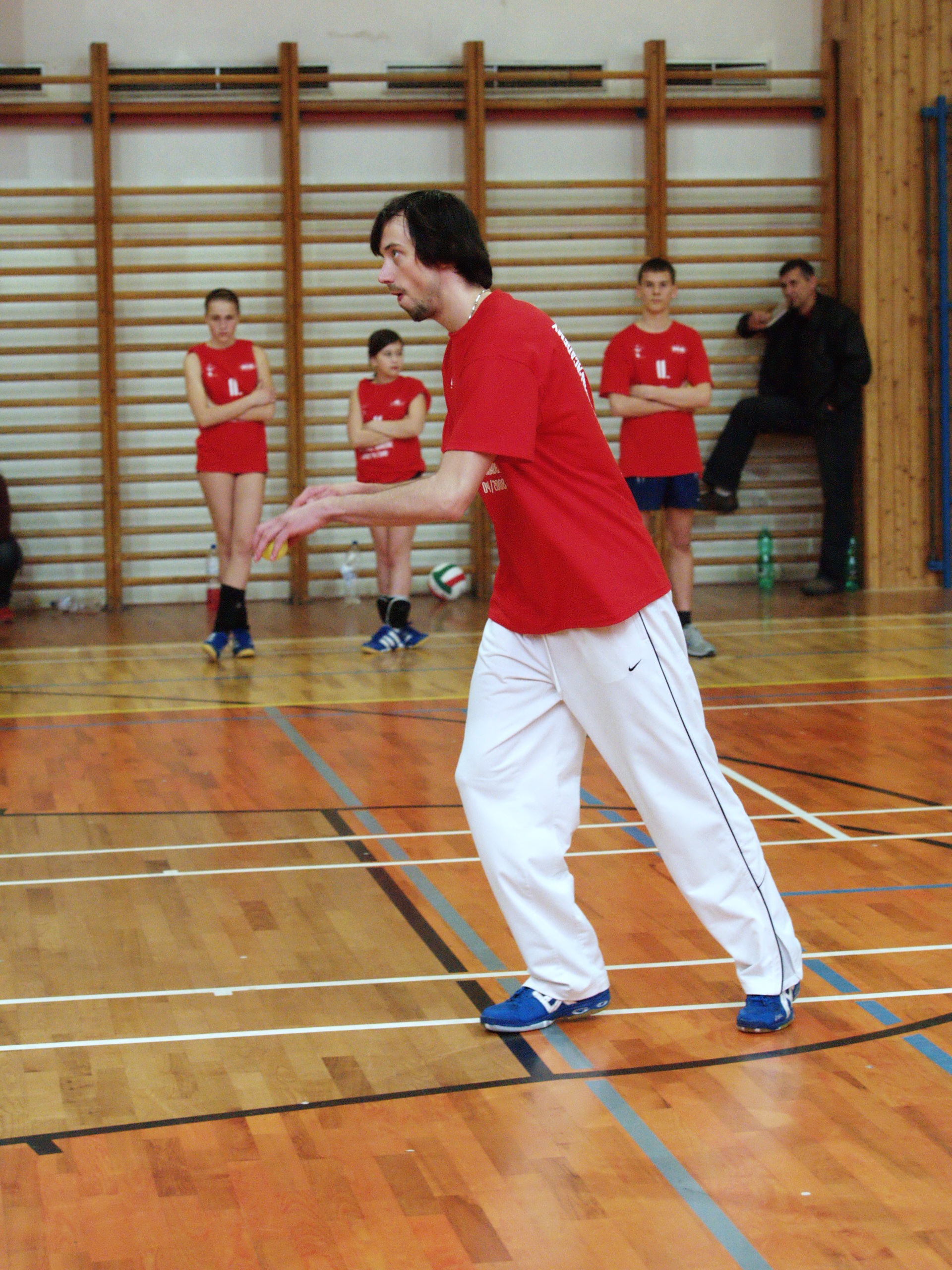 1.17 Proveď smečařský dvoukrokový rozběh s natočením do diagonály a zasmečuj s tenisovým míčkem (jednotlivci): Hráč stojí cca 3 m od sítě (vrchní díl švédské bedny, žíněnka) s levou nohou vpředu. Začíná akci v postoji, kdy spojnice ramen je kolmo k síti. Provádí dvoukrokový rozběh (P-L) se smečařským závěrem s mohutným zapažením dole i nápřahem nahoře s tím, že vzhledem ke kolmému rozběhu hráč musí během brzdícího a hlavně během dokroku upravit svůj postoj tak, aby byl otočen levým ramenem k síti. Následuje dynamický odhod tenisového míčku přes síť do diagonálního směru. V začátcích je důležité, aby hráči při závěru akce zvýraznili předpažení levé ruky a vymezovali tak optimální vzdálenost od sítě (foto 27, 28, 29).