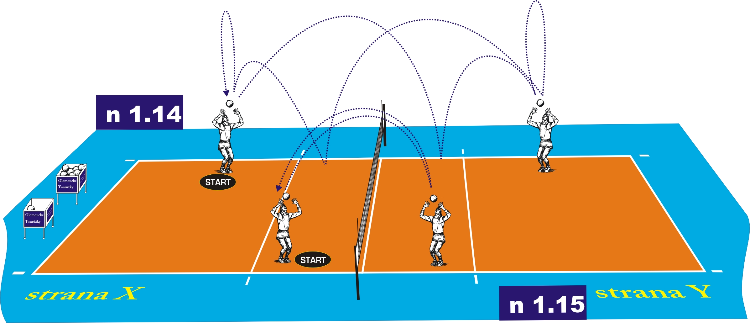 1.14 Přes síť s meziodbitím (dvojice): hráč A odbíjí míč přes síť na hráče B, ten jej po jednom dopadu na zem odbíjí nad sebe a následně zpět na hráče A, který jej po dopadu na zem opět odbíjí nad sebe a následně přes síť (obrázek 2).