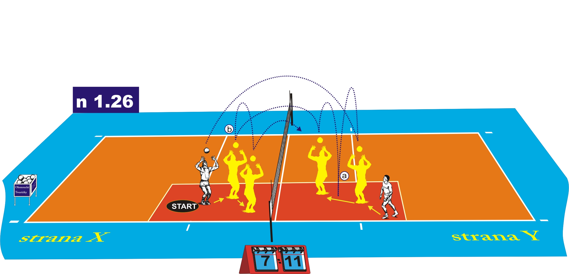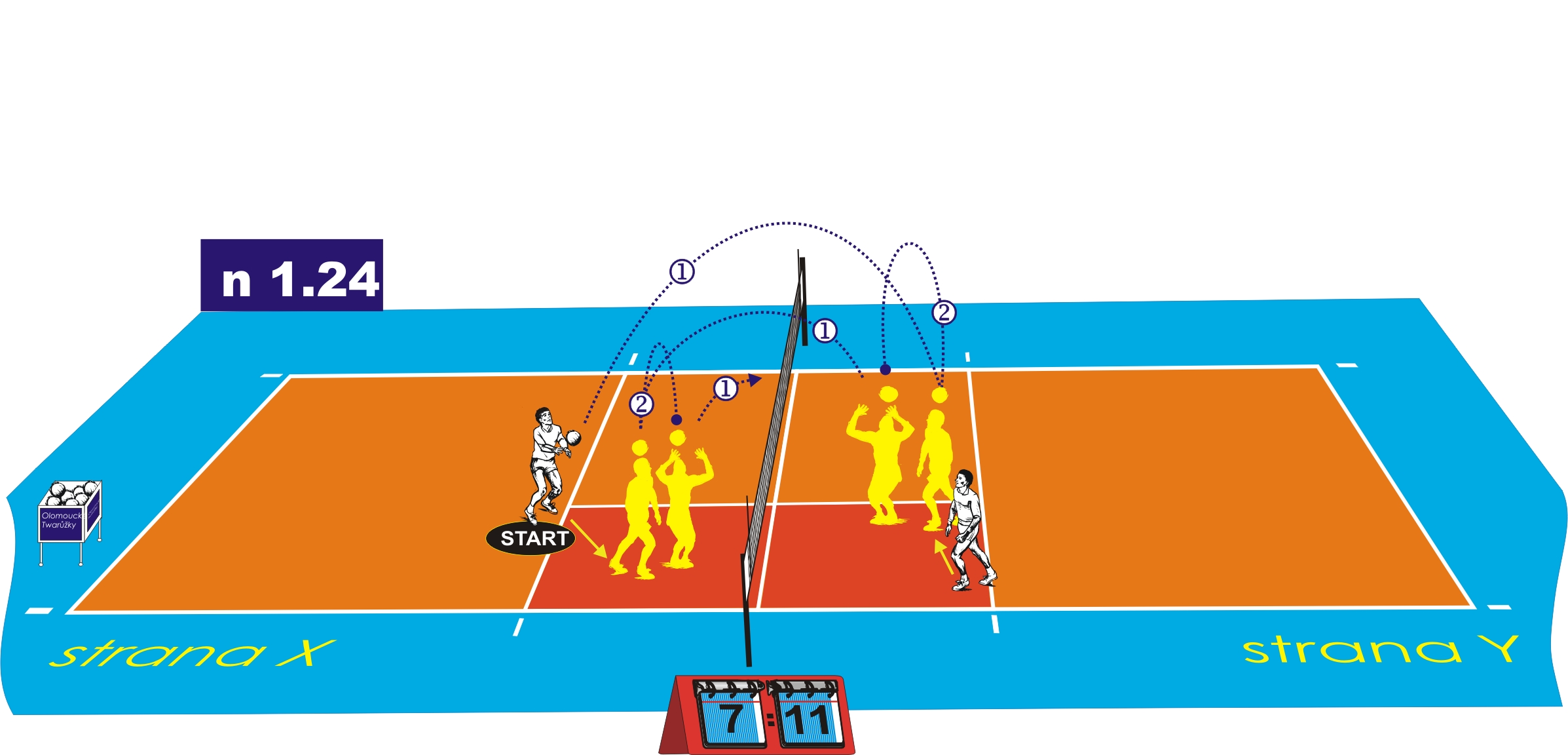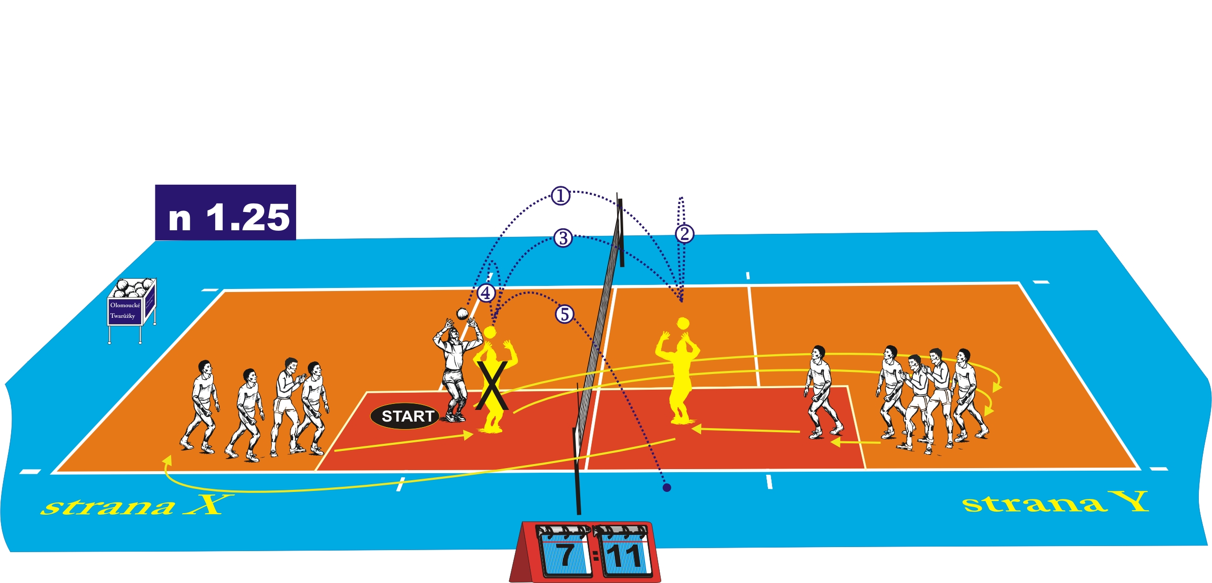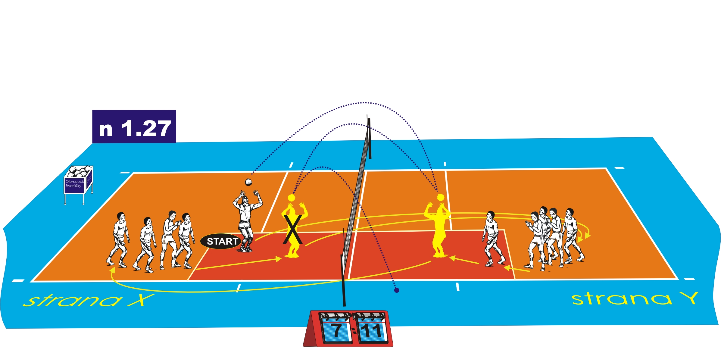 Hřiště: 3 x 4,5 m, počet hráčů: 6 – 10, pravidla a průběh: hráči stojí v zástupech na obou stranách za hrací plochou, pouze první hráč zástupu je ve hřišti. Akci zahajuje 1. hráč na straně X odbitím obouruč vrchem a následným přeběhem na stranu Y. Hráč na straně Y odbije míč vrchem přímo na stranu X a přebíhá za míčem (obrázek 10).