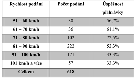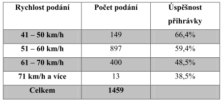 Tab. 1 Úspěšnost přihrávky smečovaného podání v závislosti na rychlosti.