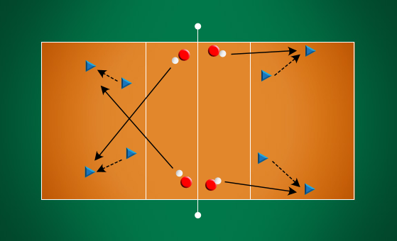 Popis: Hráč s míčem nahrává útočníkovi, upravuje herní postavení a vybírá následný úder od útočícího hráče. Po 10 vybraných balónech se hráči vymění.