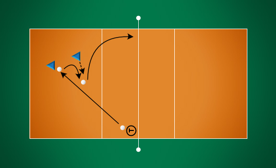 Popis: Trenér útočí (nižší razancí) ze zóny II do dvojice hráčů v zóně V a VI (I a VI). Hráč, který nevybral balón nahrává trenérovi, který s maximální razancí opět útočí do dvojice hráčů, která je ve vynuceném postavení z předchozí obrany. Hráč, který nevybíral nahrává normál do zóny IV. Všichni hráči se pravidelně střídají. Hráči, kteří necvičí sbírají balóny. Variantou cvičení je útok trenéra ze zóny IV.