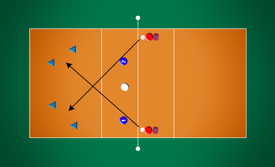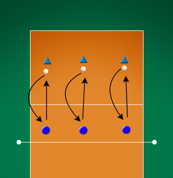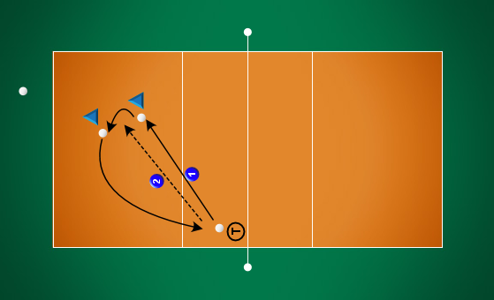 Popis: Trenér útočí ze zóny II (IV) do dvojice hráčů v zóně V a VI (I a VI). Hráč, který nevybral balón, nahrává normál do krajních zón. Všichni hráči se pravidelně střídají. Hráči, kteří necvičí sbírají balóny. Variantou cvičení je útok trenéra po lajně.