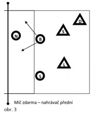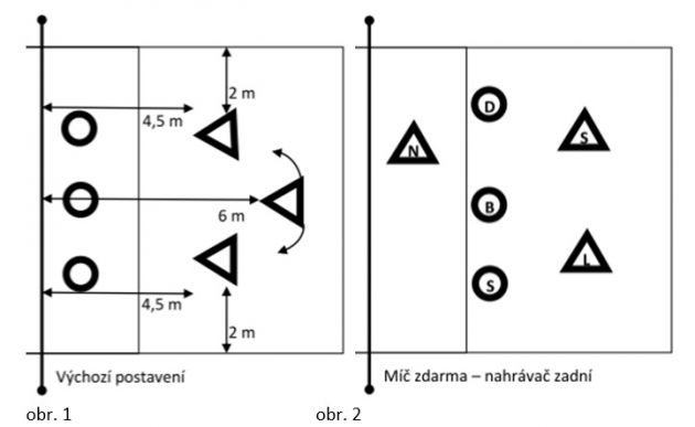2. POPIS CVIČENÍ: cvičení zahajuje trenér nadhozením míče (asi 6 m od sítě) na nahrávače strany A, ten nahrává do krajních zón. Nahrávka je dobrá nebo záměrně dál od sítě. Strana B reaguje na vzniklou situaci a brání, v případě dobré nahrávky blokuje, v případě odtažené nahrávky volá „bez“, zpracovává míč a zakládá protiútok.
