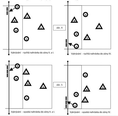 3. POPIS CVIČENÍ: na znamení trenéra (úder do míče) se hráči na straně A přesouvají z výchozího postavení do obranného postavení s trojblokem, zpracovávají míč smečovaný trenérem a zakládají protiútok. Strana B tento útok brání.