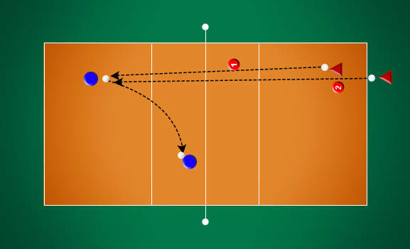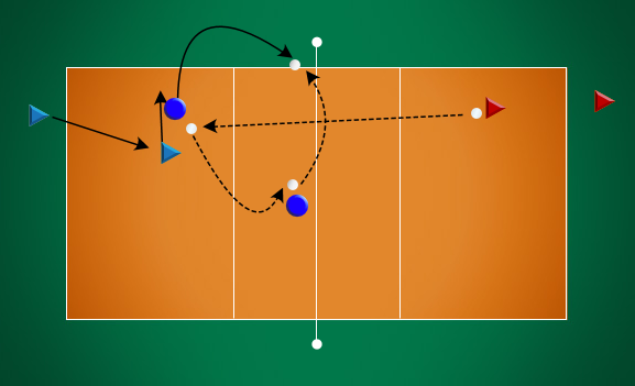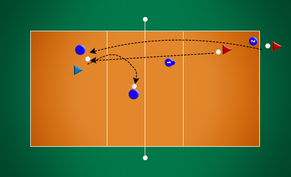 Variantou cvičení je nahrávka I do zóny VI, obě dvě hráčky se tak musí připravovat na útok. Totéž cvičení můžeme dělat i pro přihrávku v zóně VI a I.