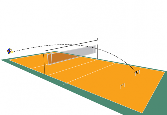 Popis: 1 podávající hráčka podává ze zóny I, 2 podávající hráčka za zónou I, na druhé straně přihrávají hráčky v zóně V a VI, pod sítí jedna hráčka chytá přihrané balóny. Střídáme rotovaný servis (hráčka 1) a plachtící servis (hráčka 2). Po určitém počtu podání (10 – 15 od každé hráčky) si hráčky změní pozici o dvě místa (žádná hráčka tak 2 x za sebou nepodává ani nepřihrává). Cvičení můžeme provádět z obou dvou stran.