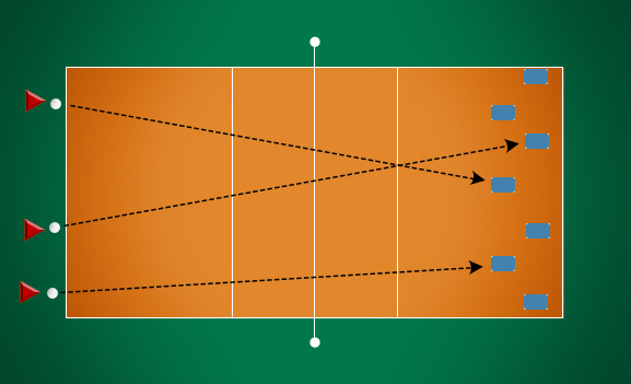 Popis: Trenér rozmístí 7 žíněnek ve hřišti tak, aby imitoval prostor mezi přihrávajícími hráči (4 žíněnky) a přihrávající hráče (3 žíněnky). Podávající hráči pak mají za úkol plnit úkoly trenéra, který má širokou variabilitu zadání, např.: trefit všech 7 žíněnek, 3 x trefit stejnou žíněnku, 3 x trefit libovolnou žíněnku, 3 x trefit žíněnku, kterou si hráč sám (nebo trenér, spoluhráč) určí před každým servisem. Cvičení můžeme koncipovat buď jako „pouhé“ splnění úkolu, nebo jako soutěž (např. kdo splní první, kdo bude mít nejvíce zásahů atd.).