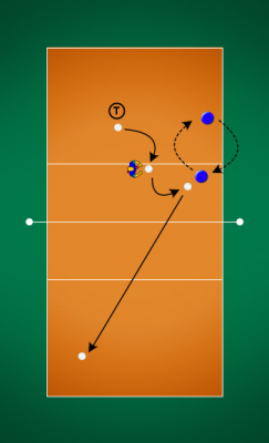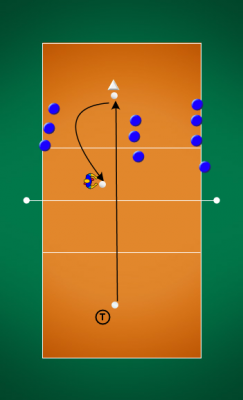 Popis: Útočící hráč si přihrává lehký balón od trenéra a po nahrávce útočí do vymezeného území, které brání polař. Útočník získává bod, pokud míč spadne do vymezeného území nebo bránící hráč balón vybere tak, že by rozehra nemohla pokračovat. V ostatních případech získává bod polař. Hrajeme do 5 bodů.