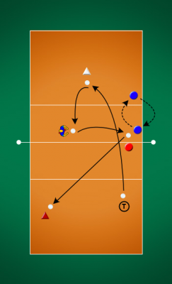 Popis: Trenér rozehrává na nahrávače, který cíleně vytváří útočníkovi různé pozice pro útok: krátkou nahrávku, přetaženou nahrávku, daleko od sítě atd., současně trenér upravuje situaci rozehraným balónem: ze sítě / z pole, blízko nebo naopak daleko od útočníka atd. Útočník tak musí neustále reagovat a vyhodnocovat nastalou situaci. Po pěti útocích se hráči střídají.