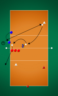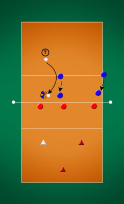 Popis: Nahrávač s útočníky hrají proti plné obraně. Za dva po sobě úspěšné útoky získává bod útočící strana, pokud dva útoky po sobě nejsou úspěšné, získává bod obrana. Útok musí získat 6 bodů, obrana 15. Cvičení zahajuje trenér rozehráním balónu na nahrávače nebo lehkým lobem do libera. Útočí 1, 2 nebo 3 hráči.