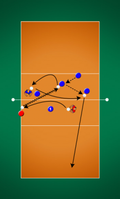 Popis: Útočící hráč opakovaně útočí proti obraně, dokud nezahraje vítězný úder. Útočníci se střídají po úspěšném útoku. Obranu volíme dle úrovně hráčů a záměru tréninku. Vrcholem tohoto cvičení je situace, kdy útočící družstvo pracuje pro svého útočníka, který útočí proti kompletní obraně. Ve všech variantách můžeme hrát na body.