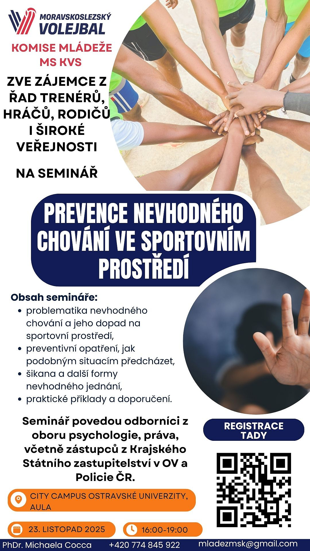 Komise mládeže Moravskoslezského KVS ve spolupráci s ÚRM a safeguardem ČVS Anetou Havlíčkovou pořádají seminář na téma Prevence nevhodného chování ve sportovním prostředí.
