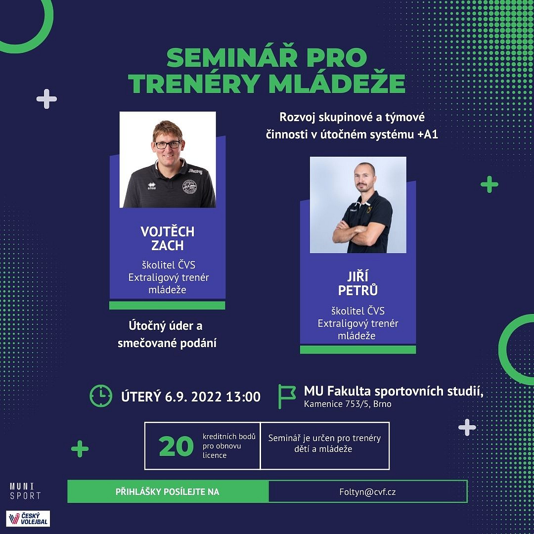Úsek vzdělávání Českého volejbalového svazu pořádá praktický seminář pro trenéry mládeže. Hlavními lektory budou školitelé ČVS a extraligoví trenéři mládeže Vojtěch Zach a Jiří Petrů.