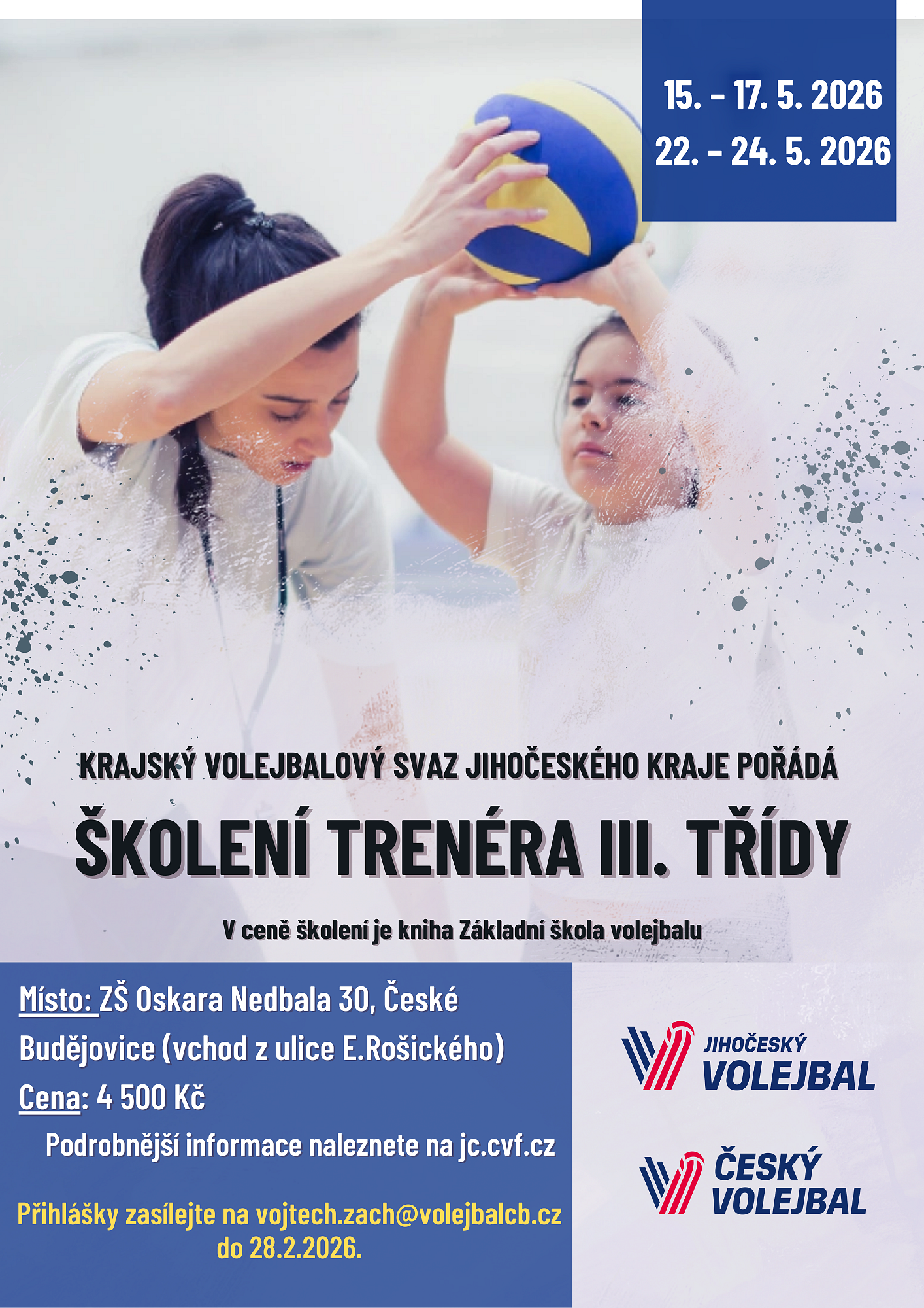 Jihočeský volejbalový svaz vypsal termíny školení trenérů 3. třídy pro rok 2026. Garantem školení je Vojtěch Zach. Dalšími lektory je Olda Záhoř, Ivana Mifková, Tomáš Pomer, Michaela Pachmanová.