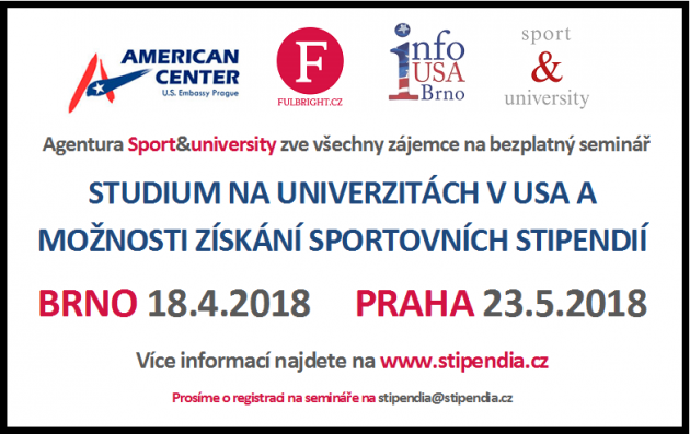 Další připravované semináře se budou konat 18. 4. 2018 v Moravské zemské knihovně v Brně a 23. 5. 2018 v Americkém centru na Velvyslanectví USA v Praze. Semináře budou rozdělené do dvou částí: 16:00 - 17:30 hod. studium na univerzitách v USA a 17:30 - 19:00 hod. sportovní stipendia na univerzitách v USA a jsou určené nejen pro studenty středních škol, ale také pro studenty vysokých škol, kteří mají možnost transferovat na univerzitu do USA. Více informací najdete na www.stipendia.cz.
